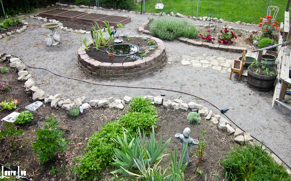 | Here is the very beginnings of my "Fairy Garden" in the center of the annual, perennial, and vegetable gardens accented by a fountain in the middle. |